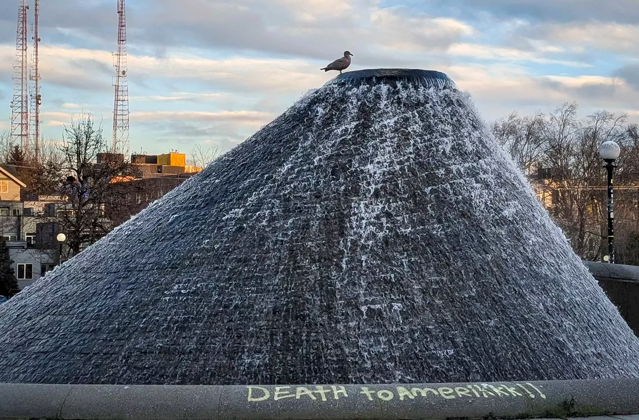 Unbeknownst to me, Councilmember Eddie Lin is also in the park, also near the fountain. In November 2025, he won District 2’s special election by nearly 40 points. On December 2, he was sworn in. Today, we are meeting at The Stranger’s office for a quick check-in. How is it going so far? Is he working on his promises? Is the job harder than he expected? That sort of thing. While talking on the phone about some community matter, Lin spots me. Does he also notice the contemplative seagull on the fountain or the anti-fascist graffiti?