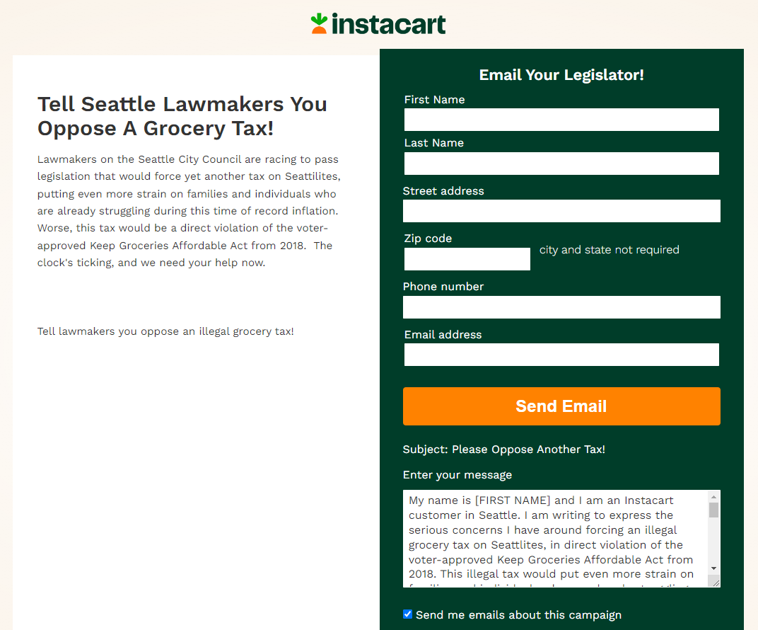 To kill my bill and undermine worker protections, Instacart recently sent out an alert to their customers calling on them to oppose the legislation. They called it a tax on groceries. That’s just a straight-up lie. The legislation explicitly exempts grocery items. But, of course, that’s not Instacart’s real problem with the legislation. They simply do not want to pay ten cents to protect their workers’ rights.Â