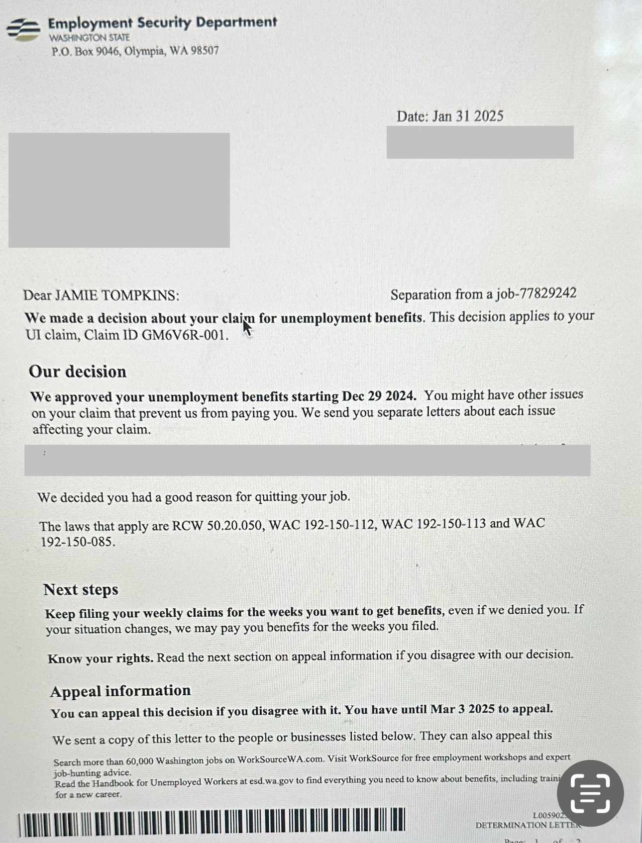 âWe decided you had good reason for quitting your job,â the stateâs decision letter reads.